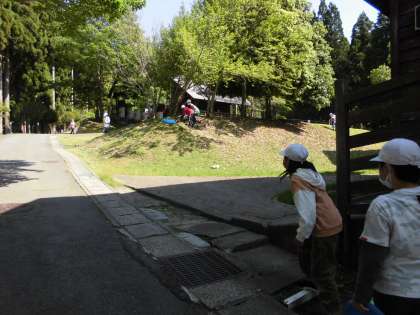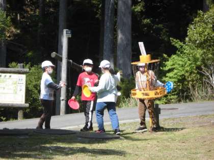 フリスビーを投げてゴールを狙い,何投で入るかを競います。