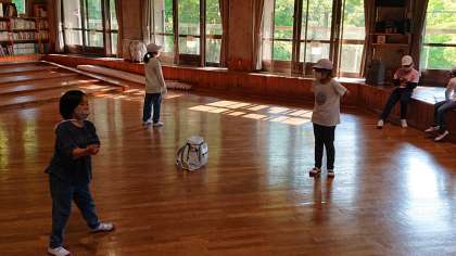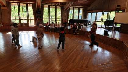 レク係がキャンプファイヤーの練習をしています。自分達でいろいろアイデアを出し合って、盛り上げます。