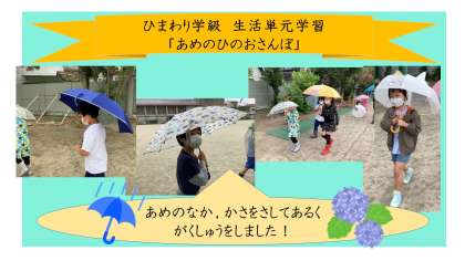 あじさいを見つけたり,水たまりに入ると音がすることが分かったりと,新たな発見がたくさんありました。傘をさしたり閉じたりするのも,今後学習を重ねていく中で上手になればいいなと思います。