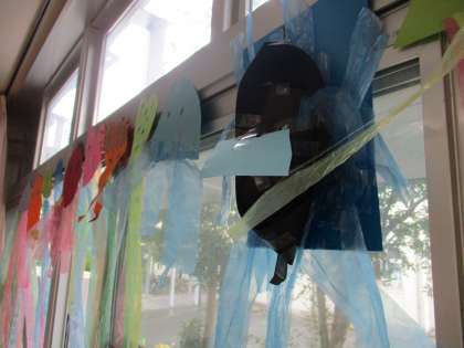 出来上がったら窓辺に飾り、ゆらゆらゆれるクラゲ、タコ、ちょうちょ、その他いろんな作品を見た子どもたちは