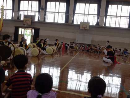「東九条マダン実行委員会」の方々にお越しいただき、韓国・朝鮮の打楽器の演奏や踊りを観たり、言葉や遊びなど、韓国・朝鮮の文化について教えていただいたりしました。特に、打楽器の演奏は「かっこよかった」「自分もやってみたい」と、驚きと感動で印象的だったようです。これからも、授業などを通して、韓国・朝鮮のことをもっと知っていけるといいですね。