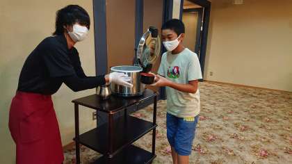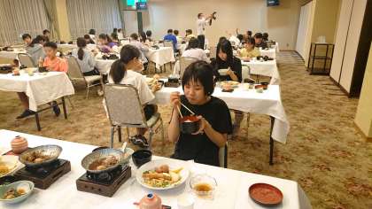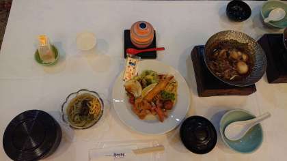唐揚げ、エビフライ、ミートボール、牛すき、茶碗蒸し…あれ、淡路島名物のびわゼリーがデザートです。