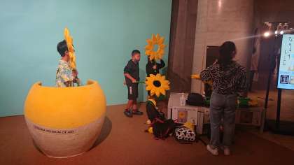 ゴッホの「ヒマワリ」を真似て…はい、ポーズ!