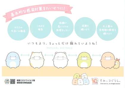 新型コロナウイルス感染症の広がりが心配されています。基本的な感染対策をたいせつに!マスクや手洗いの徹底・こまめな換気・体調が悪いときは無理をしない・混雑を避けよう・大人数や長時間の飲食を避けよう、自分ができる感染対策を続けましょう。