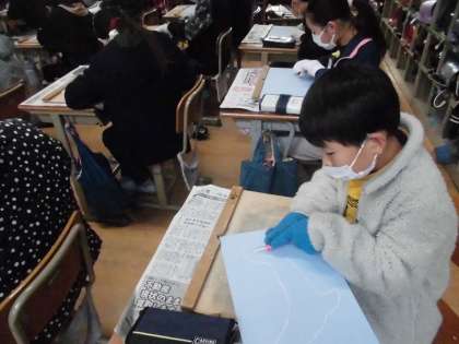 図画工作科の学習では、彫刻刀を使って、生き物をほり進めています。初めて扱う彫刻刀ですが、安全に気を付けながら使用をしています。彫刻刀の種類によっては、線の感じが違うので、一人一人表現したいものに合うように、考えながら取り組んでいます。どんな仕上がりになるのか、とても楽しみです。