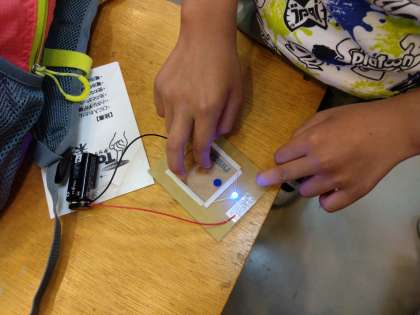 工房学習ではタッチパネルが完成です。タッチすると、LEDライトが点灯します。
