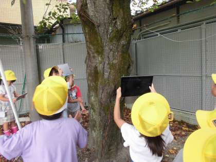 「草の近くに、バッタを見つけたよ」「落ち葉の下には、ダンゴムシがいるよ」と嬉しそうに友達と話す姿が見られました。そして、見つけた生き物をGIGA端末で撮影をし、みんなで交流をしました。