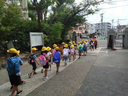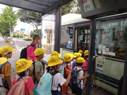 今日は遠足です。バスに乗って水族館に向かって出発!