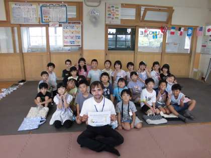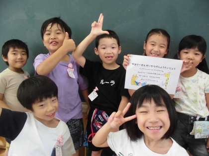 中間休みにイングリッシュルームでALTの先生に”Brown bear”の絵本のよみきかせをしていただきました。”Brown bear, Brown bear, What do you see?”をリズムに合わせて子どもたちも発音していました。絵本の中でいろいろな色や動物が出てきて、子どもたちもそれをみるたびに「おー!レッドや!」や「ドッグ!」など興味深々の様子でした。