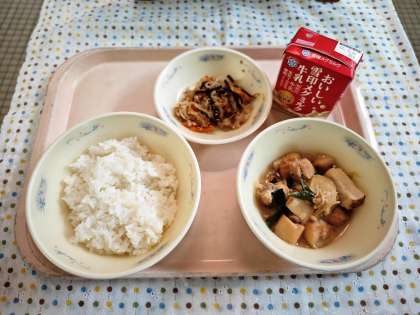 給食時間に視聴する動画で「かしわ」について紹介しました。子どもたちは「へー」「たしかに」と納得の様子でした。野菜のうまみがたっぷり染み出したすきやきはほのかに甘く、ご飯にもよく合います。子どもたちもしっかり食べていて、残菜もとても少なかったです。