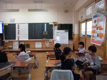 国語科で「うみのかくれんぼ」を学習しています。今日は、教科書の本文にはなにがどんな順でかかれているのかを見つける学習をしました。タブレットをつかって、ロイロノートの中の資料に線をひき、友だちと交流したり、全体で共有したりしました。子ども司会の授業で子どもたち自身で授業を進められるようになりました。タブレットもどんどん使いこなしています。