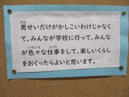学習後は子どもたちから「自分も男女関係なくすごそうと思いました。」「男女関係なく生きるというのは,一人一人自由を守ることにつながっていることが分かったので、ぼくは料理が好きなので、男女関係なく料理を続けていきたいです。」という感想が出されました。
