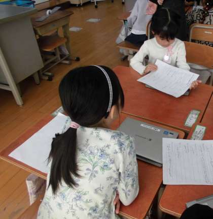 今日は、「大きさ」「目と耳のようす」「あかあさんと似ているか」「自分で歩けるか」「食べ物」「成長の仕方」の6つの視点を探し、友達に説明をしました。お互いにアドバイスを出し合い、よりよい「Baby カード」が仕上がるといいですね。