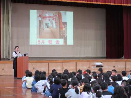 今年度最初の朝会がありました。1年生が入学してから初めて、全校のみんなが体育館に集まりました。校長先生のお話を一生懸命に聞いたり、学年目標を元気な声で発表したりして、張り切っている様子がよく伝わってきました。