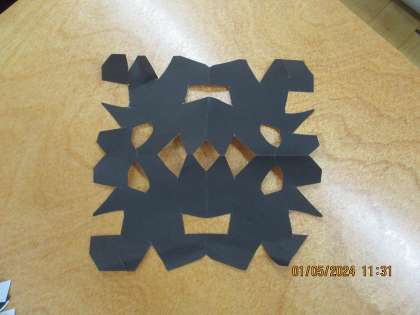 図画工作科では、折り紙を折ったり切ったりして模様を作りました。「ダイヤの形になったよ。」「ギザギザに切ると面白い形が出てくるよ。」などと話し合いながら楽しく、安全に活動することができました。
