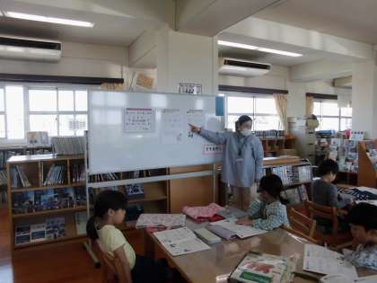 今年度着任された学校司書の先生に、図書館オリエンテーションをしていただきました。図書館や読書ノートの使い方について、改めてご指導いただいた後、読み聞かせもしていただきました。今年度も図書館を活用し、たくさんの本と触れ合ってほしいです。