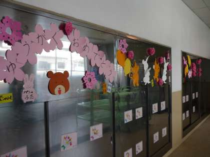 給食室では、季節の感じられる掲示物づくりに取り組んでいます。給食がはじめての1年生も、楽しく給食時間が過ごせるようにサポートしていきたいと思います。