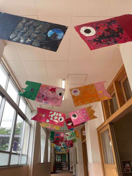 ひまわり学級の教室前の廊下では、みんなが作ったこいのぼりがお出迎えしてくれています。