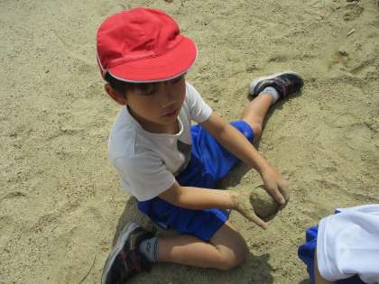 図画工作科では「すなやつちとなかよくなろう」の学習を進めています。子どもたちは砂場で、友だちとなかよくいろいろなものをつくっていました。「先生泥団子できた〜。」「富士山をつくったよ。」など泥だらけになりながら楽しんでいました。