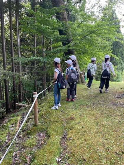 冒険の森で思い切り楽しんだ後は、スコアオリエンテーリングです。所内にあるポイントを巡り、クイズに答えていきます。たくさん歩いて少し疲れた様子もありますが、自然を満喫しています。