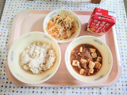 今日の「マーボ豆腐」と「春雨のいためもの」はどちらも久しぶりの登場でした。春雨のいためものには春雨のほか、もやし・人参・玉ねぎ・椎茸が使われており野菜たっぷりのボリューム感のある副菜でした。