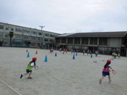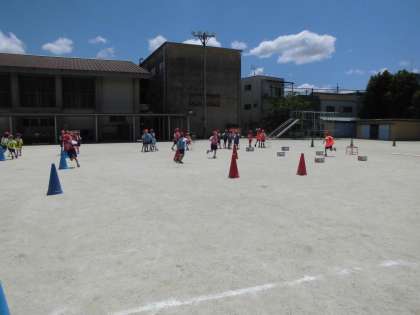 体育科では、リレーあそびをしています。コーンをジグザグに進むぐねぐねコース、コーンをぐるっと回りながら走るぐるぐるコース、箱をとび越えて走るぴょんぴょんコースなど、様々なコースを楽しみながら走っています。