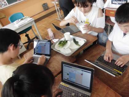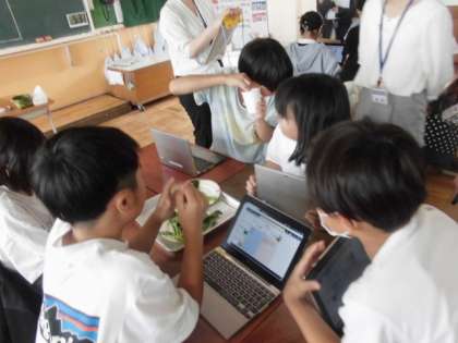 ゆでることのよさについて考えました。ほうれん草とジャガイモの実物を、ゆでる前後で比べることで、より実感をもつことができました。