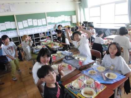 グループで、おいしくいただいています。楽しく、適量を、時間内に食べています。