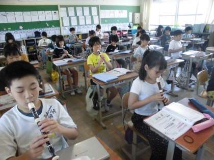 リコーダーは、背筋をのばし、体全体を楽器にして演奏するよう心がけています。どんどん上達し、音が重なってきていてます。