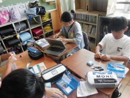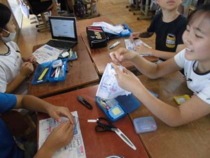 玉結び、玉どめをして、なみ縫いに挑戦しています。動画や友達のアドバイスを参考にしながら、がんばっています。