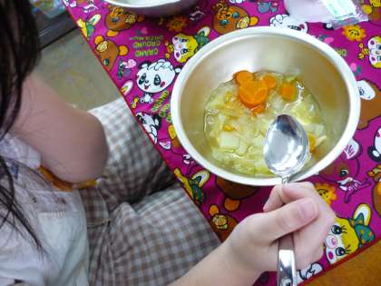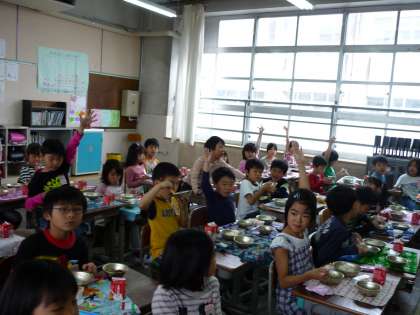 子どもの日のお祝いと一緒に、給食を楽しめるよう「春野菜のスープ煮」の人参を5種類の形にくりぬきました。教室をまわっていると「あ!ラッキーにんじんみっけ!」「ミッキーのかたちや〜」と楽しそうにお皿を眺めていました。「ラッキーにんじんをみつけたひとはいますか〜?」と聞くと、「はい!はい!はい!」と元気な声もたくさん聞こえてきました。