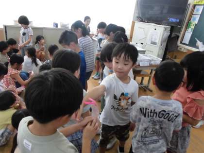 5時間目に、1年生と2年生で交流会を行いました。2年生が学校たんけんに連れて行ってくれたり、アサガオの種をプレゼントしてくれたりしたお礼にと、1年生がしおりをプレゼントしてくれました。しおりは、アサガオの花の色水で染めたそうです。1年生からのプレゼントに、2年生は、「1年生が心を込めて作ってくれてうれしい!大事にする!」と喜んでいました。