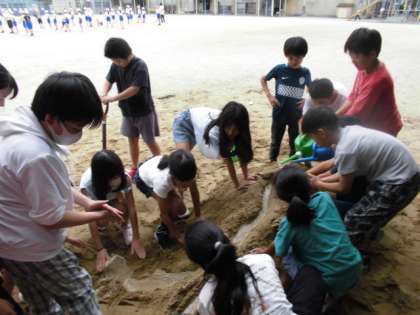 砂場で、「流れる水のはたらき」を観察する実験を行いました。「やっぱり外側がけずられている!しかも、下の方がけずられている!」「水が多いとすぐ崩れるなあ。」「下の方には泡と石がたまったよ。」「カーブが多すぎるとうまく流れないんだね。」