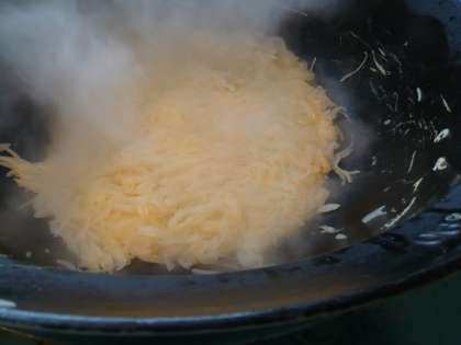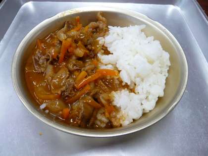 今,給食室で使っているのは春にとれる”新たまねぎ”です。水分が多くてやわらかく,辛味が少ないという特徴があります。和風・洋風・中華風といろいろな料理に合いますね。今日は,ハッシュドビーフに新たまねぎを使いました。ハッシュドビーフのおいしさの秘密は,たまねぎをあめ色になるまでよく炒めることです。子ども達にはとても人気のメニューで,みんな食缶をからっぽにして返却してくれました。