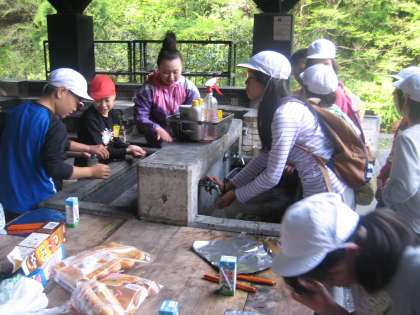今日の朝ごはんは,野外炊事です。パックドックを作りました。