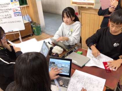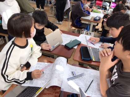 11月22日に研究発表会を開催しました。京都市内だけでなく、他府県からもたくさんの先生が参観に来られ、校内での研究授業とは少し違った緊張感がありましたが、学習を進めるにつれ、いつものみんなが戻ってきました。研究発表会では、「図形の拡大と縮小」という単元で、校区地図やグーグルマップを使って、実際の道のりを計算する学習をしました。地図上での長さを測り、そこから10000分の1や5000分の1などの縮尺をかけて計算します。西京極小学校から西京極駅までの道のりは?という問題で、グーグルマップが表示する道のりよりも短い行き方を探しました。また、6年生の担任団が実際に歩いて測った道のりとも比べて、正しく計算できているかも確認!ニアピン賞(誤差が少ない)を獲得した班も多く、盛り上がりました!