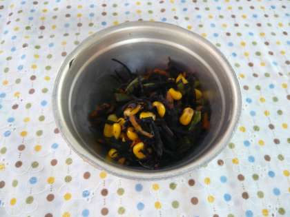 「ひじきのソティ」は,とても簡単にできる副菜です。ひじきは春にやわらかいものを採取し,乾燥させたものです。とても低カロリーなのに,カルシウムが多いので,1回に食べる量は少なくても,とても良いカルシウムの供給源となります。今日は,チキンカレーとの組み合わせで献立をたてました。