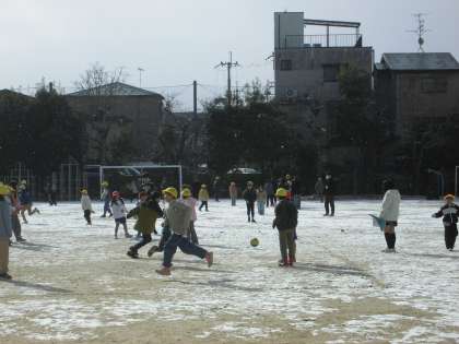 運動場では雪が降っていましたが、顔を真っ赤にしながら、ボール遊びや鬼遊びを