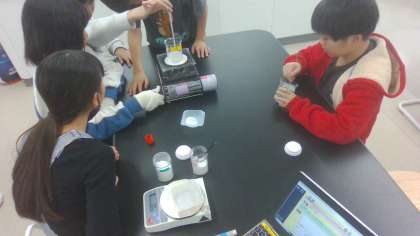 「水の温度を上げることで、水にとけるものの量はどのように変わるのか」を確かめる実験をしています。食塩とミョウバンを比較することで、ものの性質について、より深く考えることができています。