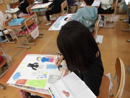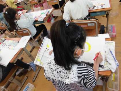 生活の中から、楽しかったことやドキドキしたことなどを思い出し、絵に表しました。2年生で学習した絵の具も上手に使いながら、絵を描き上げることができました。