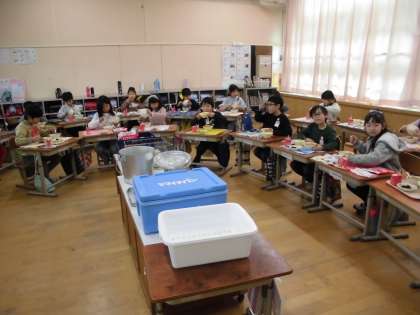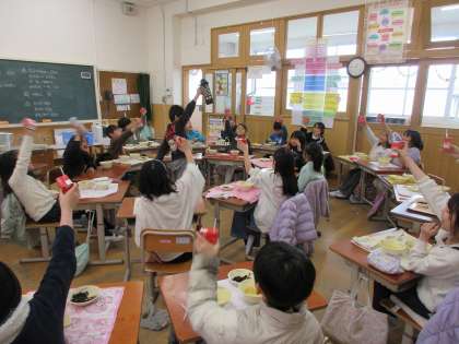 今日は2年生最後の給食でした。最後の給食は、みんなで円になって楽しくおいしくいただきました。