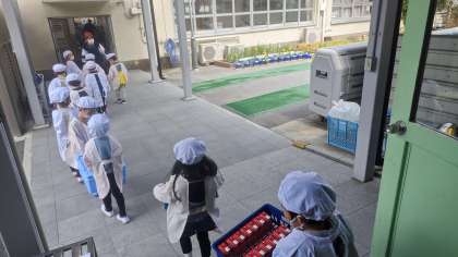 初日はドキドキの一年生でしたが、2日目になると自信をもって給食当番を頑張っていました。