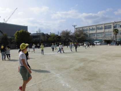 運動場で「学年しっぽとり」をして仲を深めました。