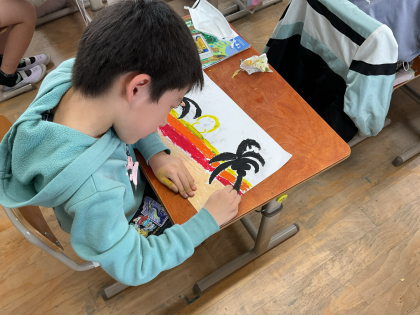色を重ねたり、ぼかしたり、引っかいたりしながら、工夫してかくことができました。友だちの作品のステキを見つけ、自分の作品に取り入れる様子も見られました。