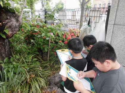 理科の学習で観察スケッチをしました。よく見てスッケチし、気づいたことをたくさん書き込みました。また、温度計の使い方を知り、自分たちで気温をはかりました。