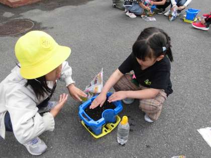たてわりの1年生と、アサガオの種をまきました。
