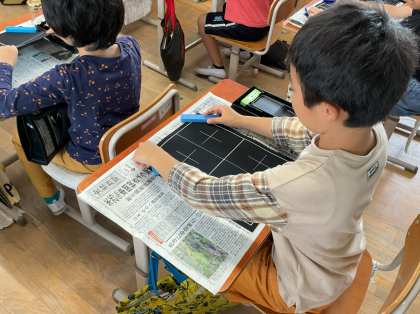 はじめての毛筆学習にワクワクしながら、用具の名前や置き方を学習しました。授業の後半では、筆の持ち方や力の加減に気を付け、細い線や太い線、ジグザグの線を書くことを楽しんでいました。