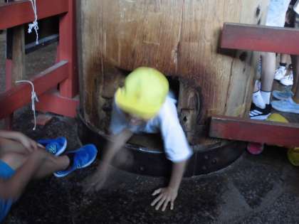 その後は、柱の穴くぐりに挑戦しました。くぐり抜けると無病息災や願いがかなうといわれている柱の穴くぐり。子どもたちは、見事通り抜けることに成功しました!