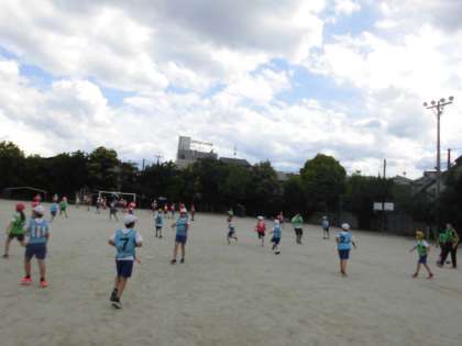 陸上部では、基礎練習をした後、しっぽ取り大会をしました。教員も混ざり、チームに分かれて対決をしました。「相手がいるからゲームができる」ので、「相手チームに感謝と敬意の心をもつ」ことが大切だということを学ぶことができました。