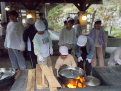 初めての野外炊事ではご飯を炊き、すき焼き風煮を作りました。うまくできるか心配でしたが、みんなで協力し、おいしく仕上がりました。途中から雷が鳴り、大雨が降ってきてびっくりしましたが、片付けが終わることろには小降りになってきました。